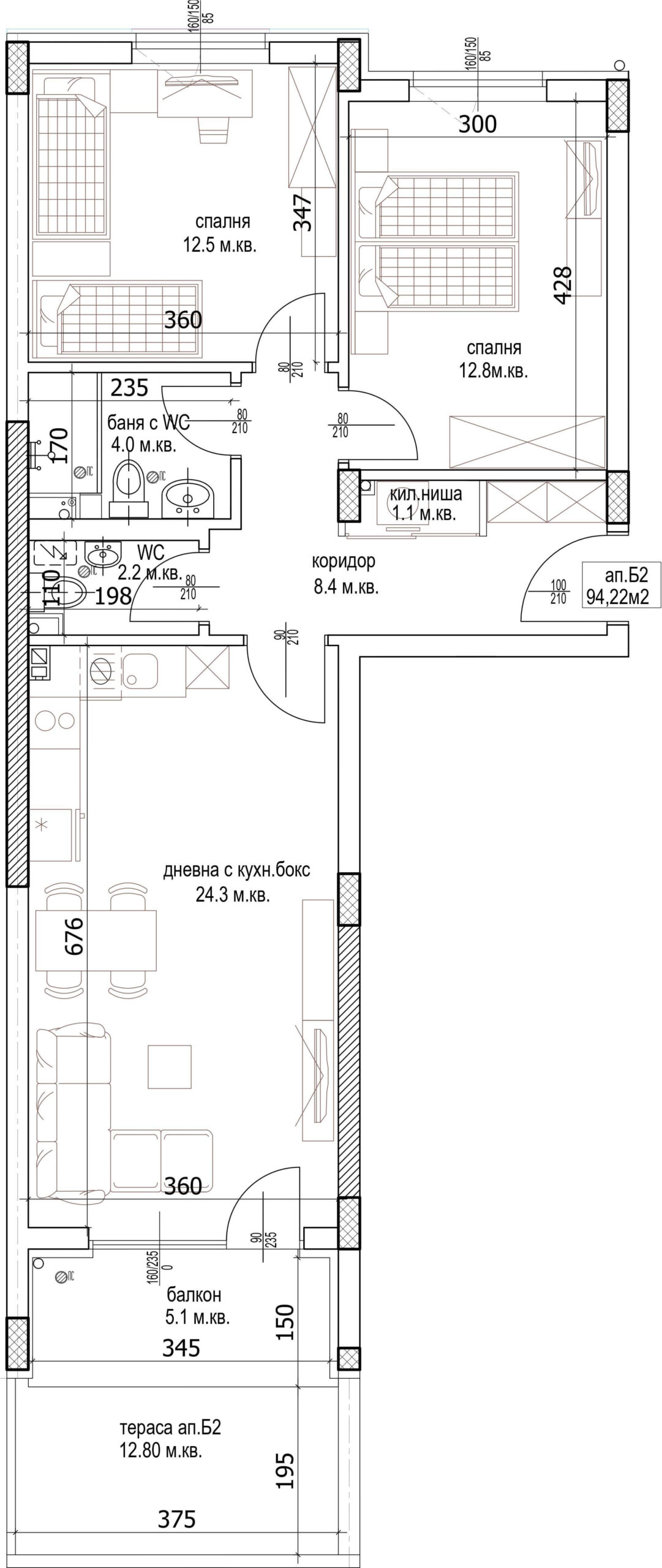 Апартамент – дневна с кухненски бокс, 2 спални, баня с тоалетна, тоалетна, килер, коридор, балкон и тераса.