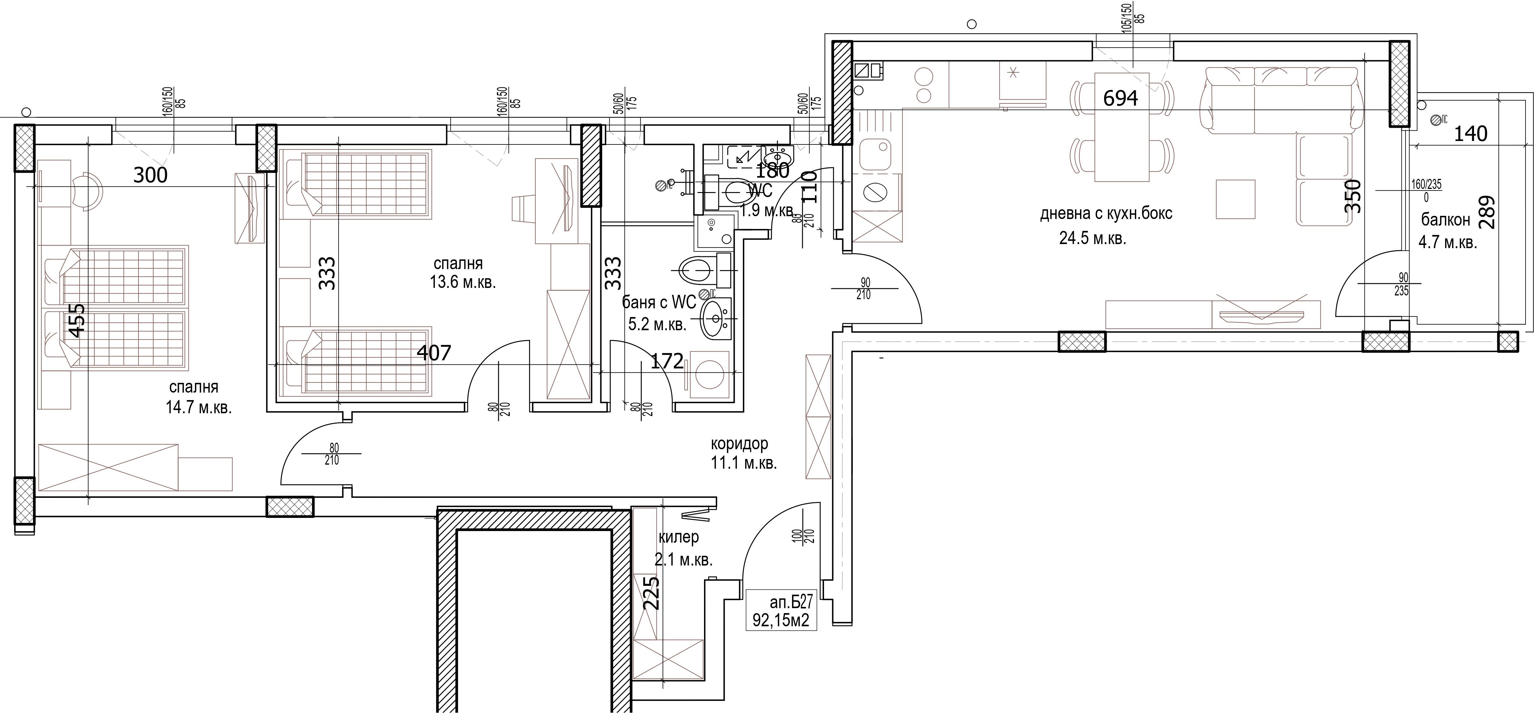 Апартамент – дневна с кухненски бокс, 2 спални, баня с тоалетна, тоалетна, килер, коридор и балкон.