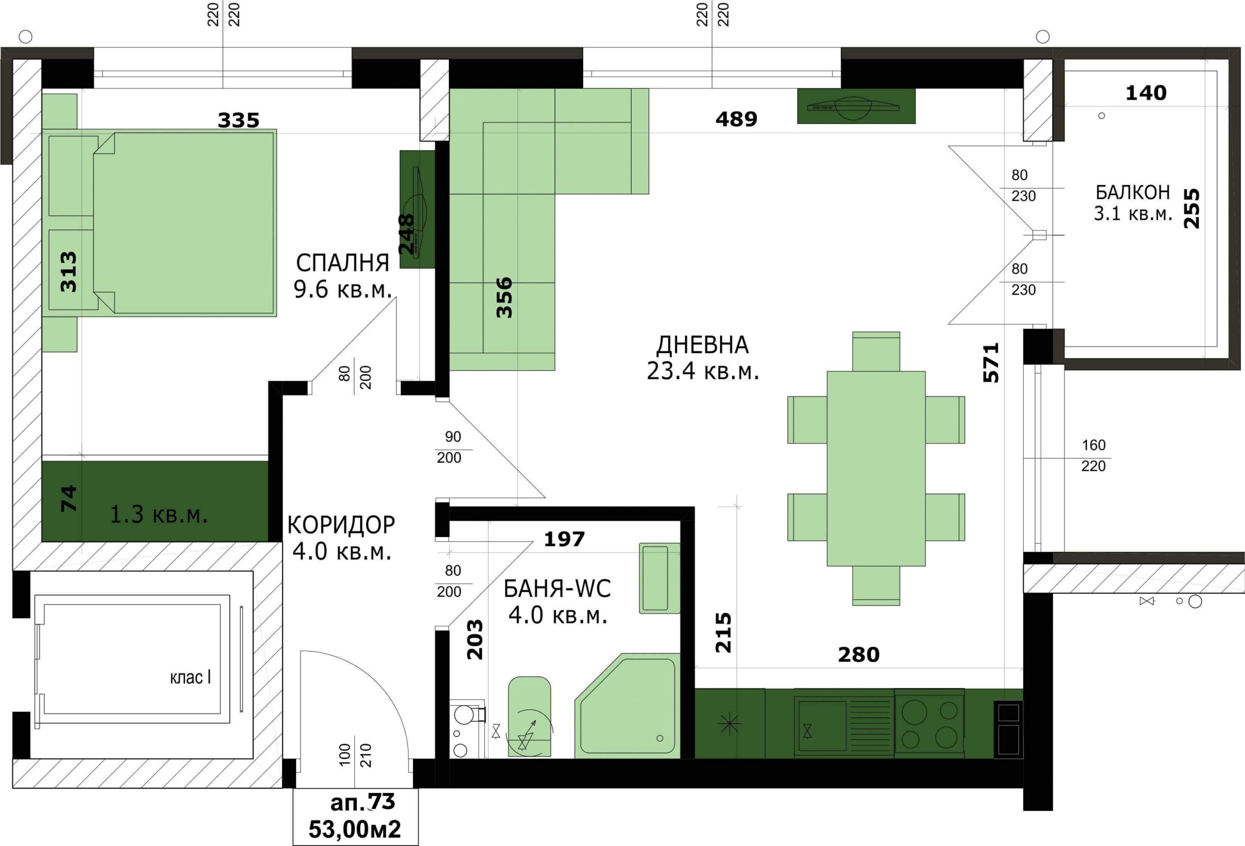 Апартамент – дневна с кухненски бокс, спалня, баня с тоалетна, дрешник, коридор и балкон