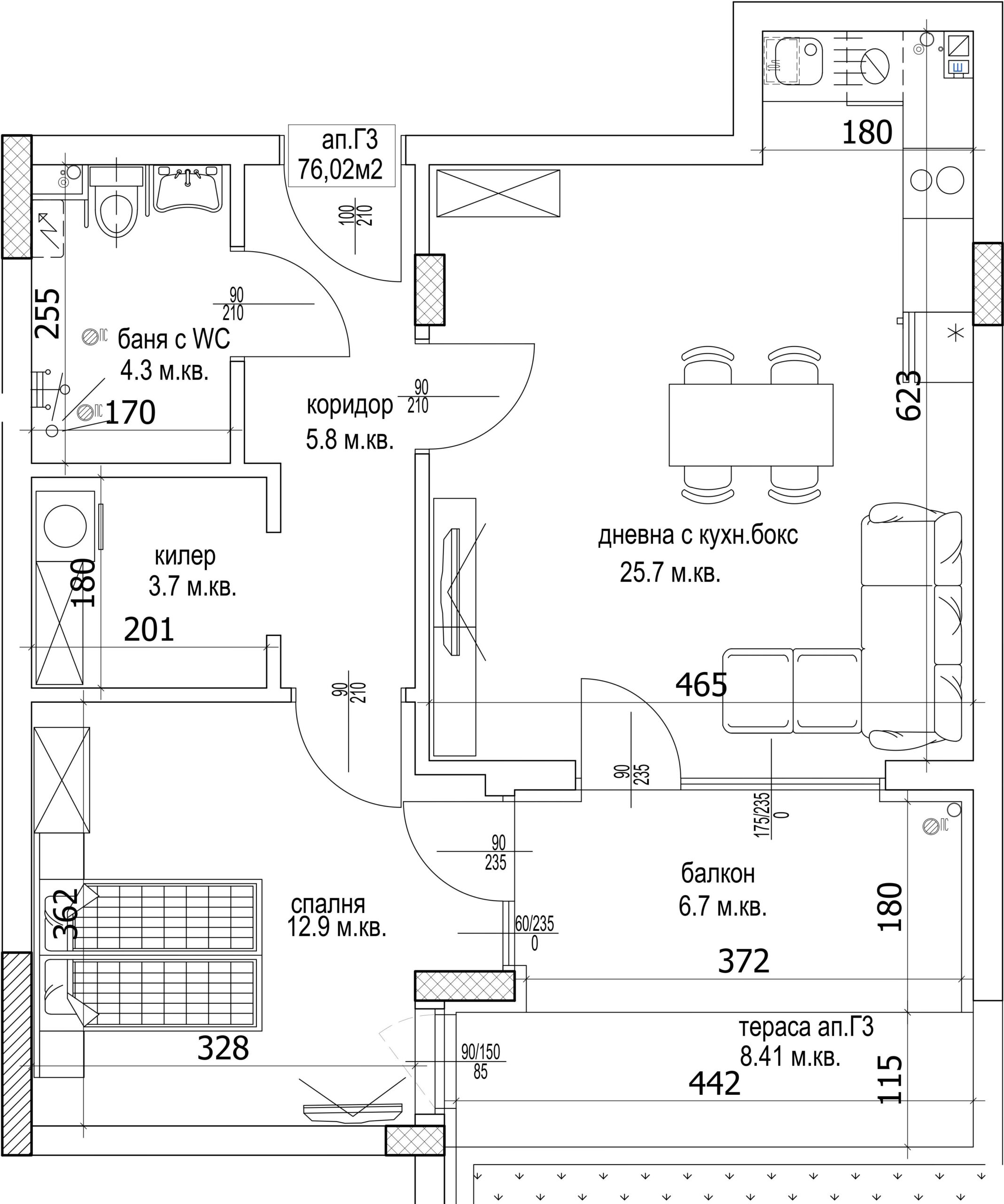 Апартамент – дневна с кухненски бокс, спалня, баня с тоалетна, килер, коридор, балкон и тераса.