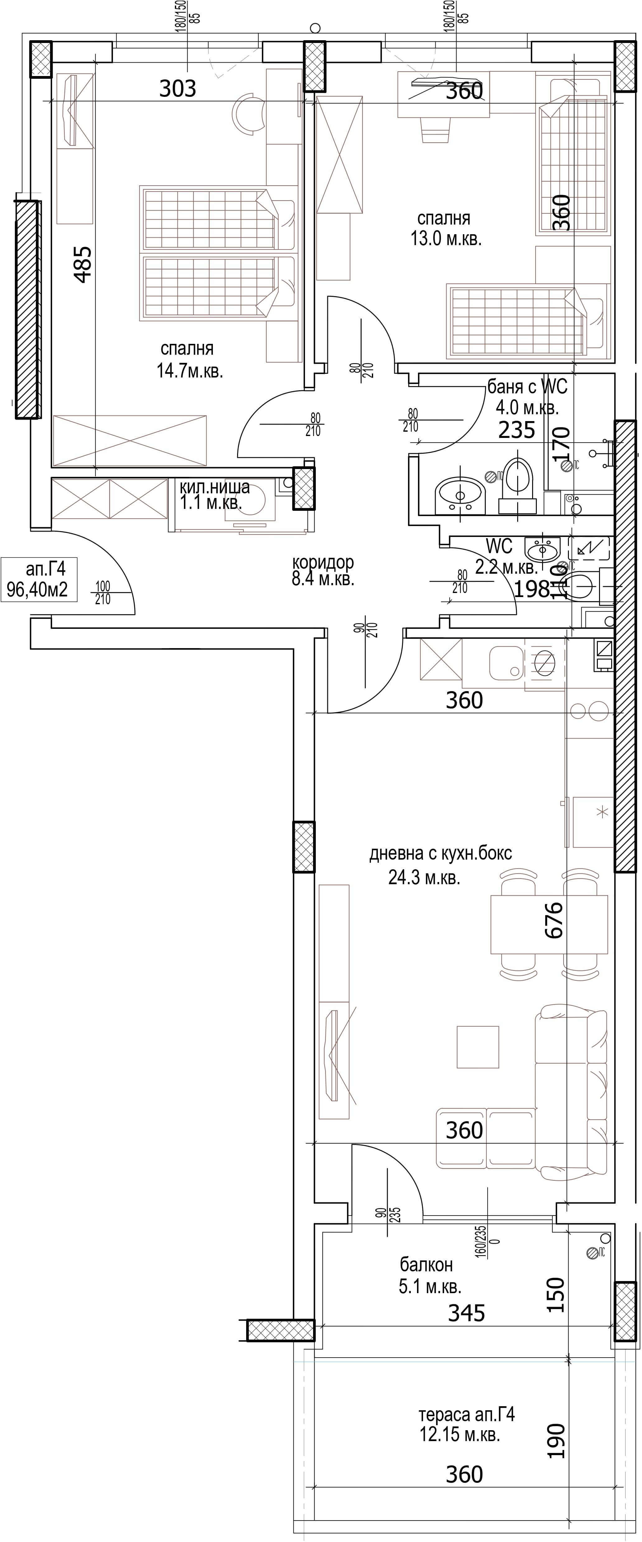 Апартамент – дневна с кухненски бокс, 2 спални, баня с тоалетна, тоалетна, килер, коридор, балкон и тераса.