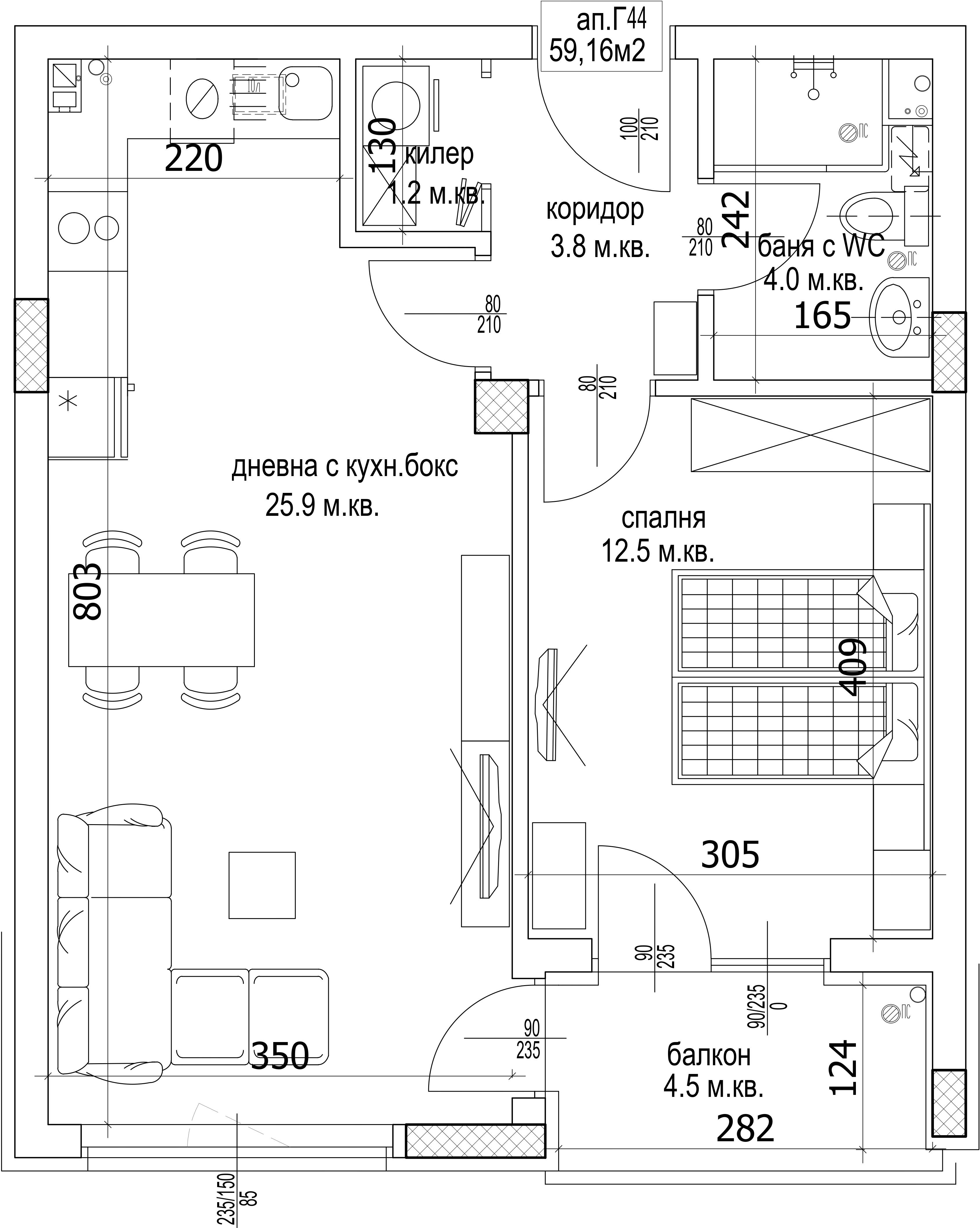 Апартамент – дневна с кухненски бокс, спалня, баня с тоалетна, килер, коридор и балкон.