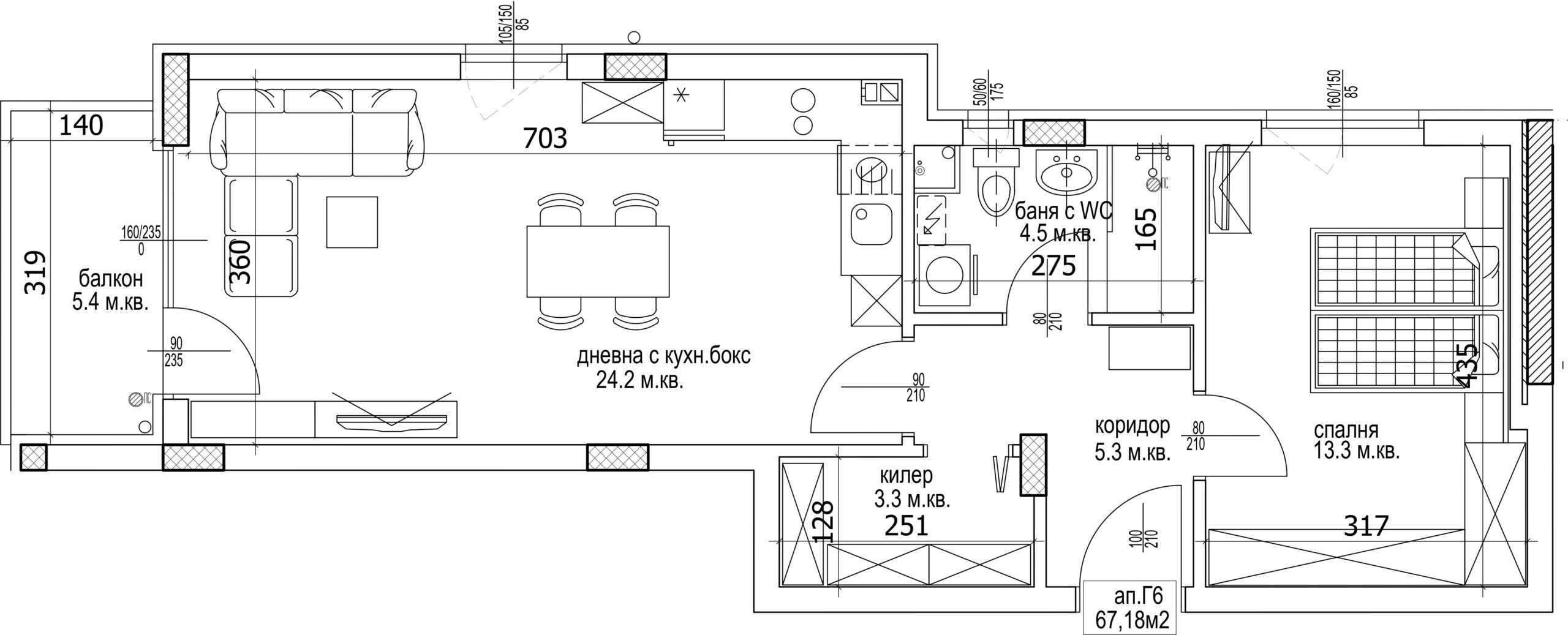 Апартамент – дневна с кухненски бокс, спалня, баня с тоалетна, килер, коридор и балкон.