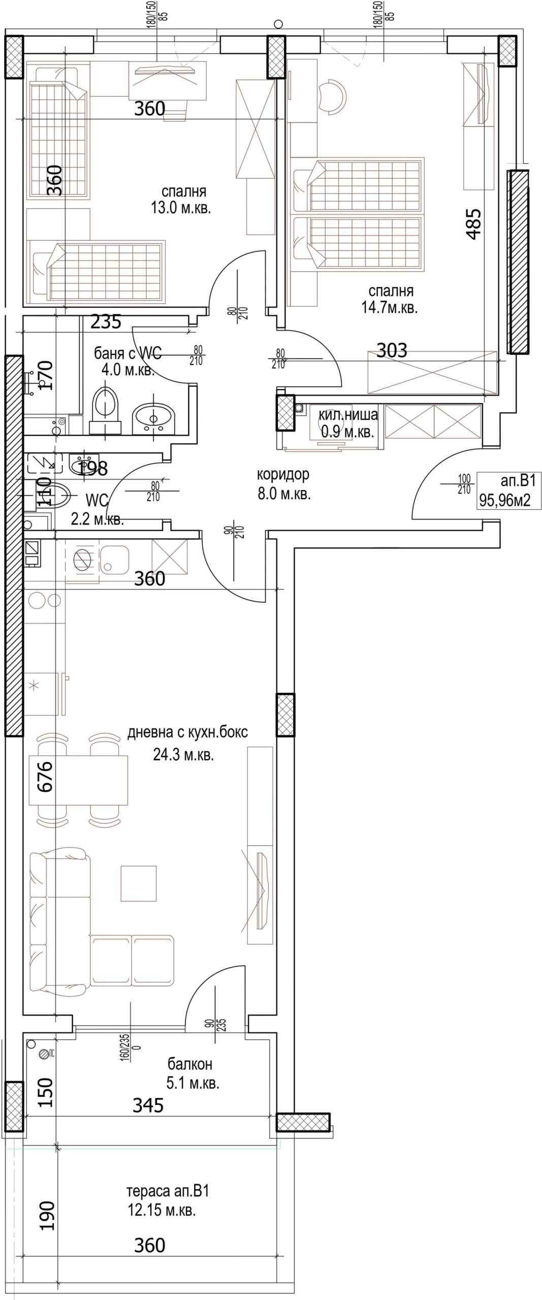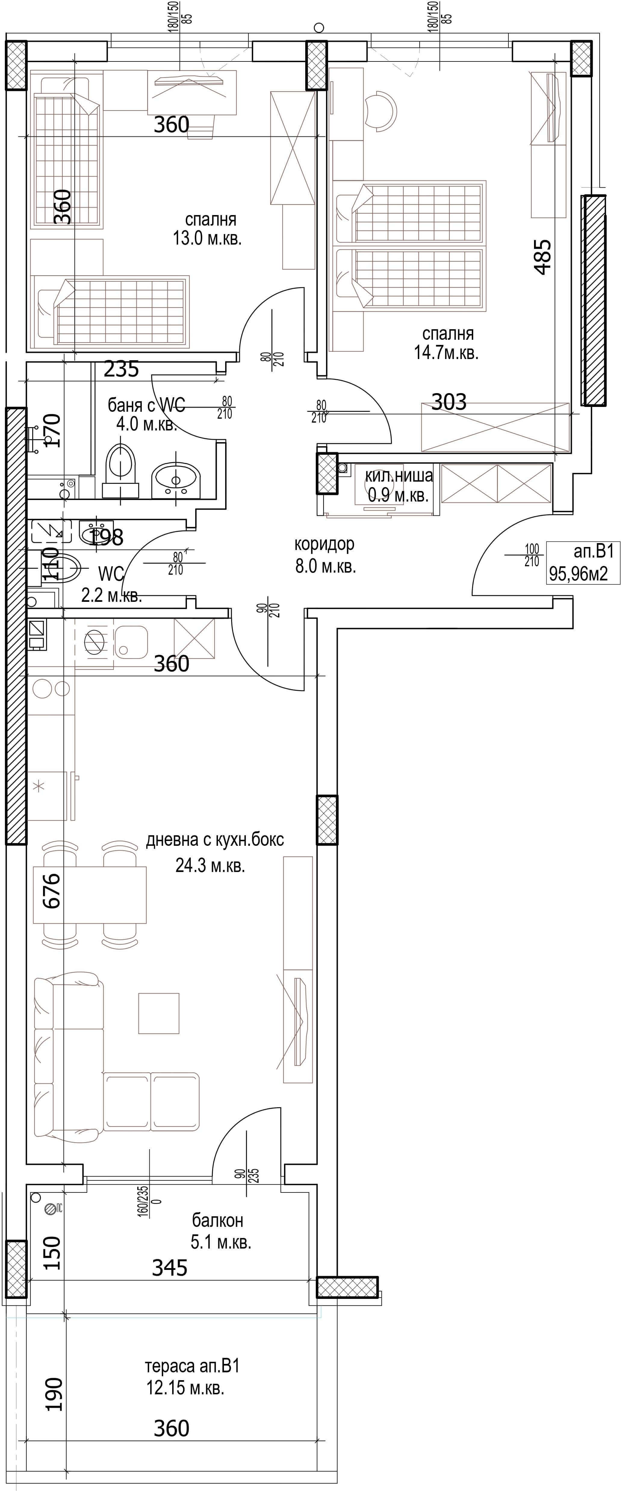 Апартамент – дневна с кухненски бокс, 2 спални, баня с тоалетна, тоалетна, килер, коридор, балкон и тераса.