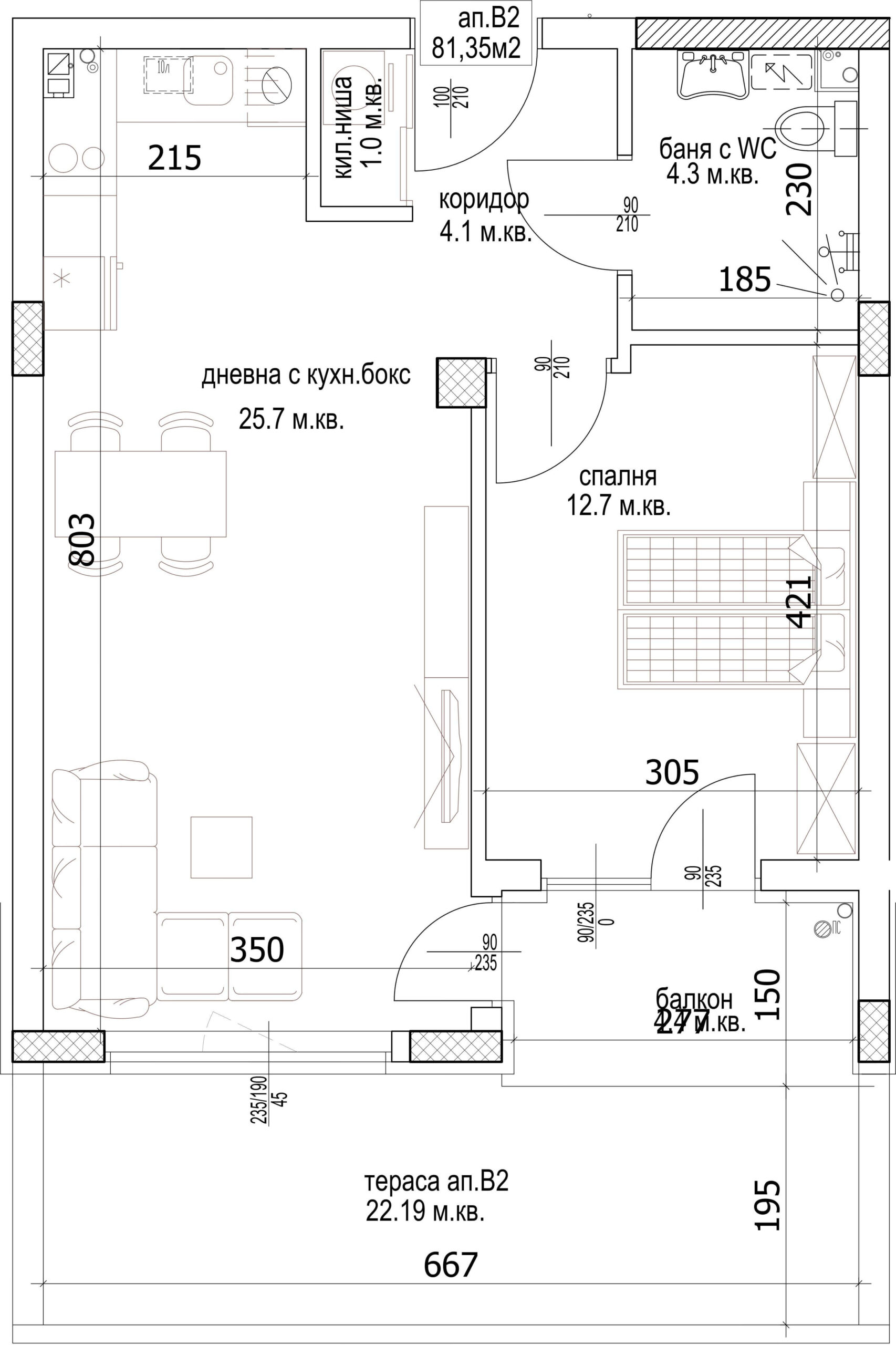 Апартамент – дневна с кухненски бокс, спалня, баня с тоалетна, килер, коридор, балкон и тераса.