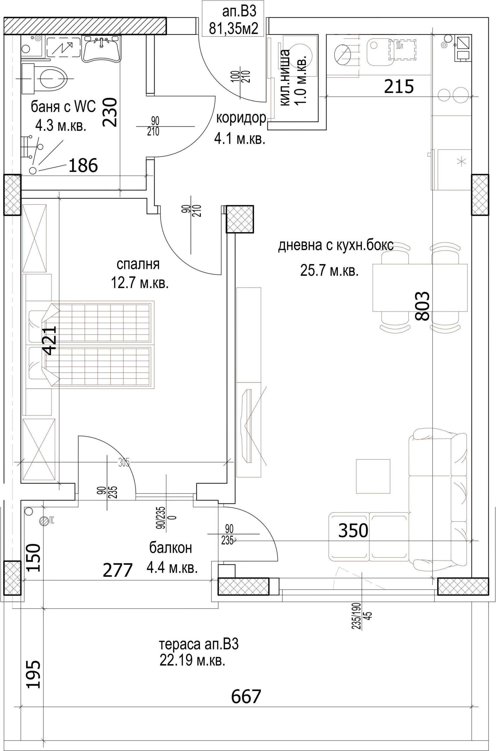 Апартамент – дневна с кухненски бокс, спалня, баня с тоалетна, килер, коридор, балкон и тераса.