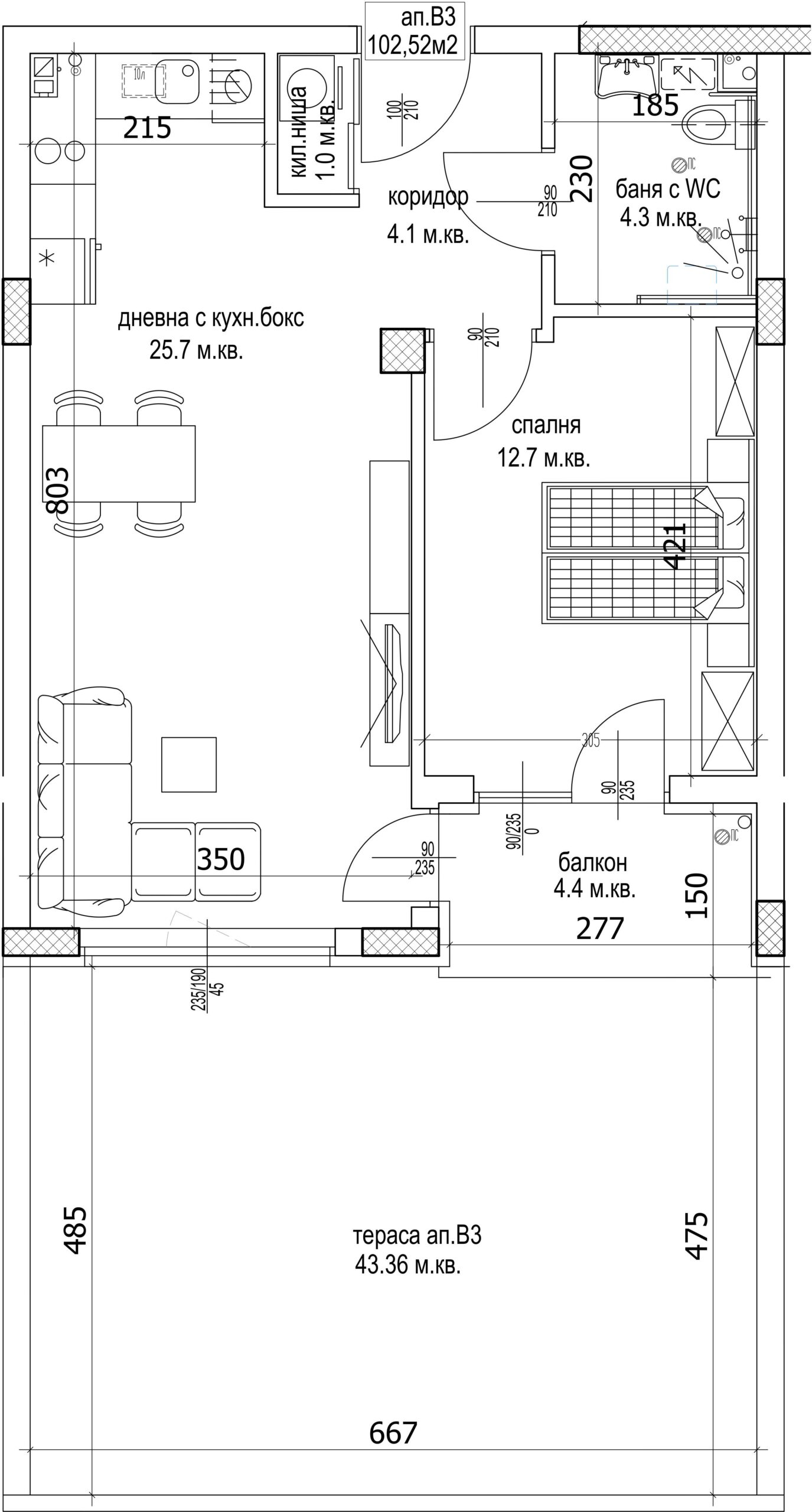 Апартамент – дневна с кухненски бокс, спалня, баня с тоалетна, килер, коридор, балкон и тераса.