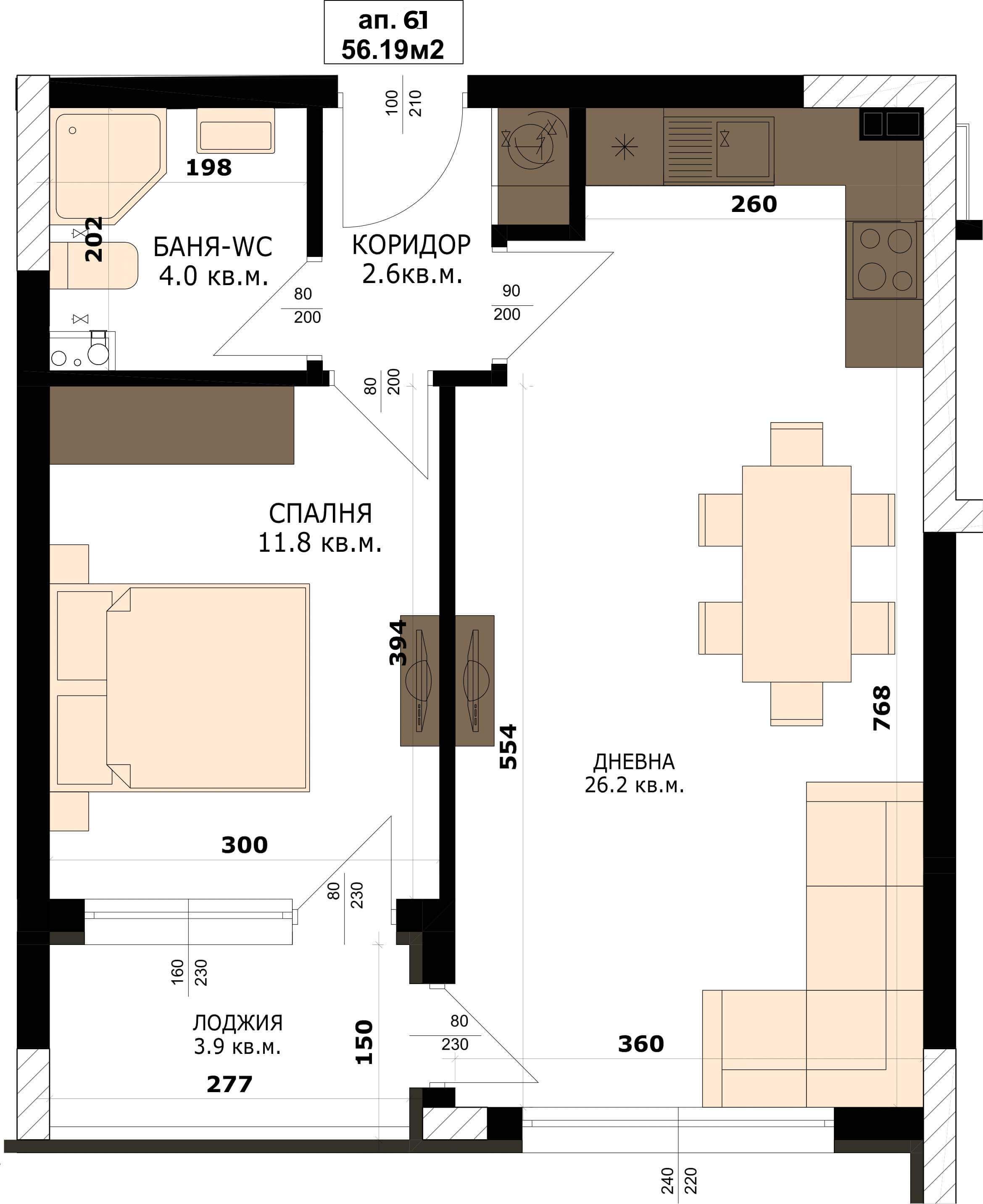 Апартамент – дневна с кухненски бокс, спалня, баня с тоалетна, килер, коридор и лоджия