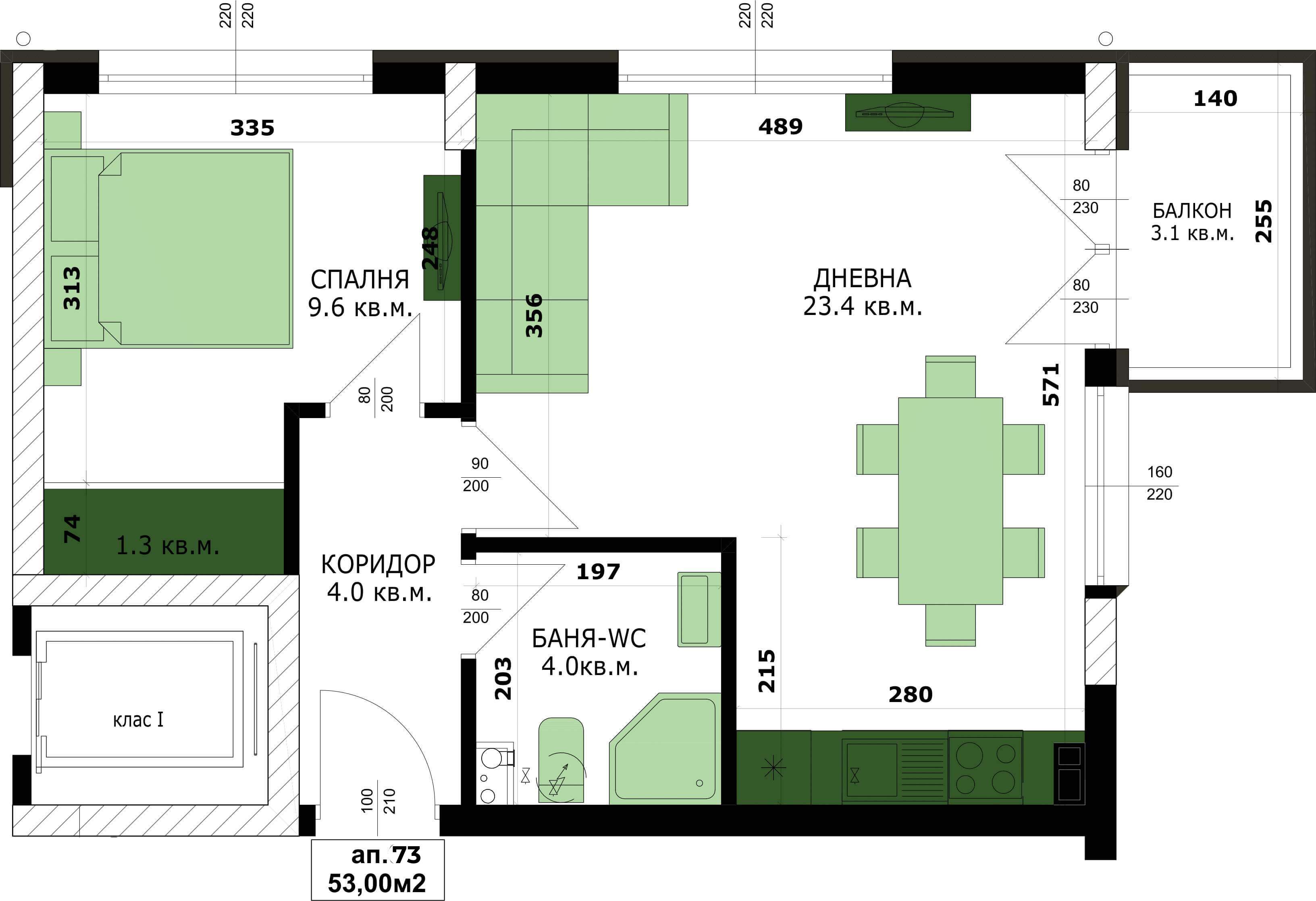 Апартамент – дневна с кухненски бокс, спалня, баня с тоалетна, дрешник, коридор и балкон